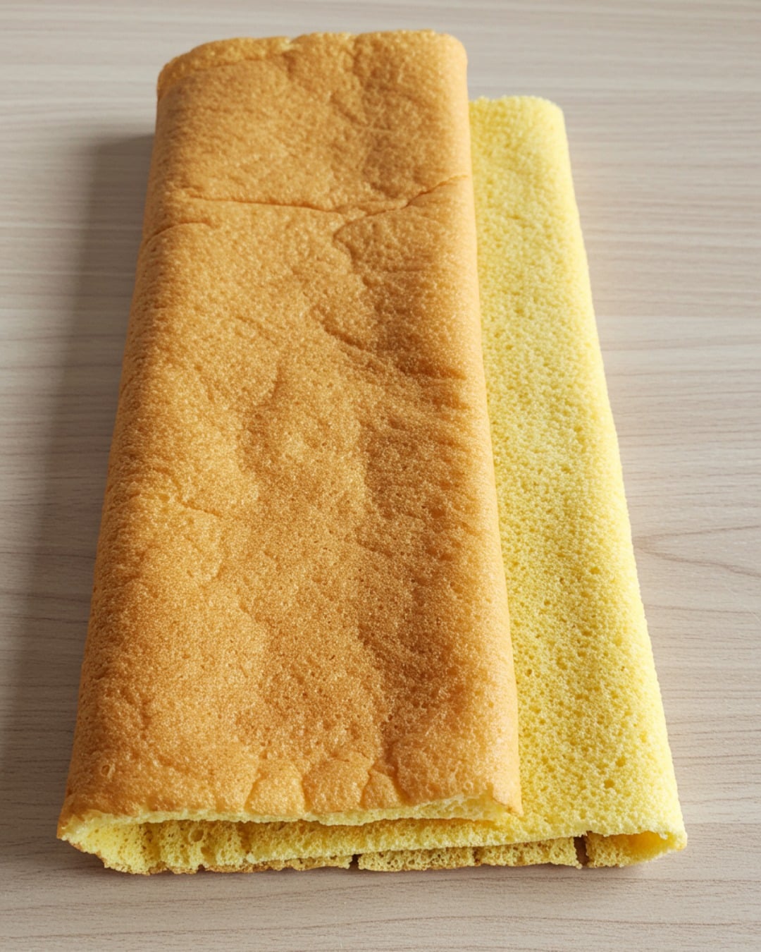Error fatal: Sobre-hornear aunque sea 2 minutos adicionales resultará en bizcocho que se agrieta inevitablemente al enrollar. Es mejor sub-hornear ligeramente que exceder.